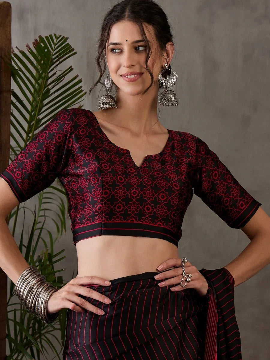 This black semi-modal saree exemplifies functional elegance through its carefully selected fabric composition. Semi-modal fibers provide superior tenacity and dimensional stability compared to traditional materials, ensuring the garment maintains its structural integrity through repeated wear and laundering. The deep black colorway offers exceptional versatility, serving as a sophisticated foundation for diverse styling approaches across formal and casual contexts. The fabric's inherent breathability and moisture management properties make it particularly suitable for extended wear in varied climates. The semi-modal construction also exhibits natural resistance to pilling, contributing to long-term garment durability. The coordinated blouse piece is engineered to complement the saree's drape characteristics. For the discerning consumer seeking a saree that combines technical performance with timeless aesthetic appeal, this piece delivers measurable advantages in comfort, longevity, and styling flexibility.