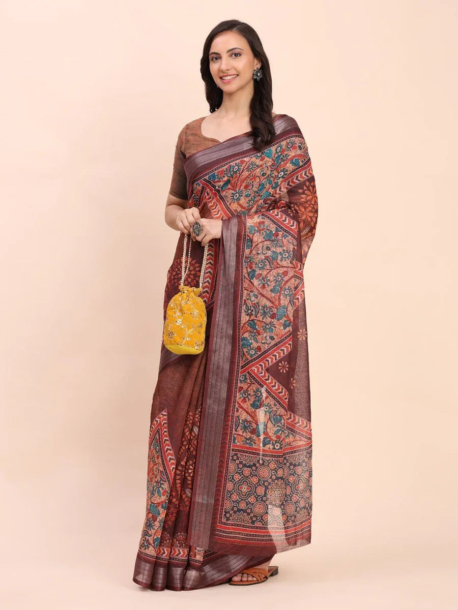 Brown SANSKRIT PRINTS Linen Cotton Saree with Blouse Piece