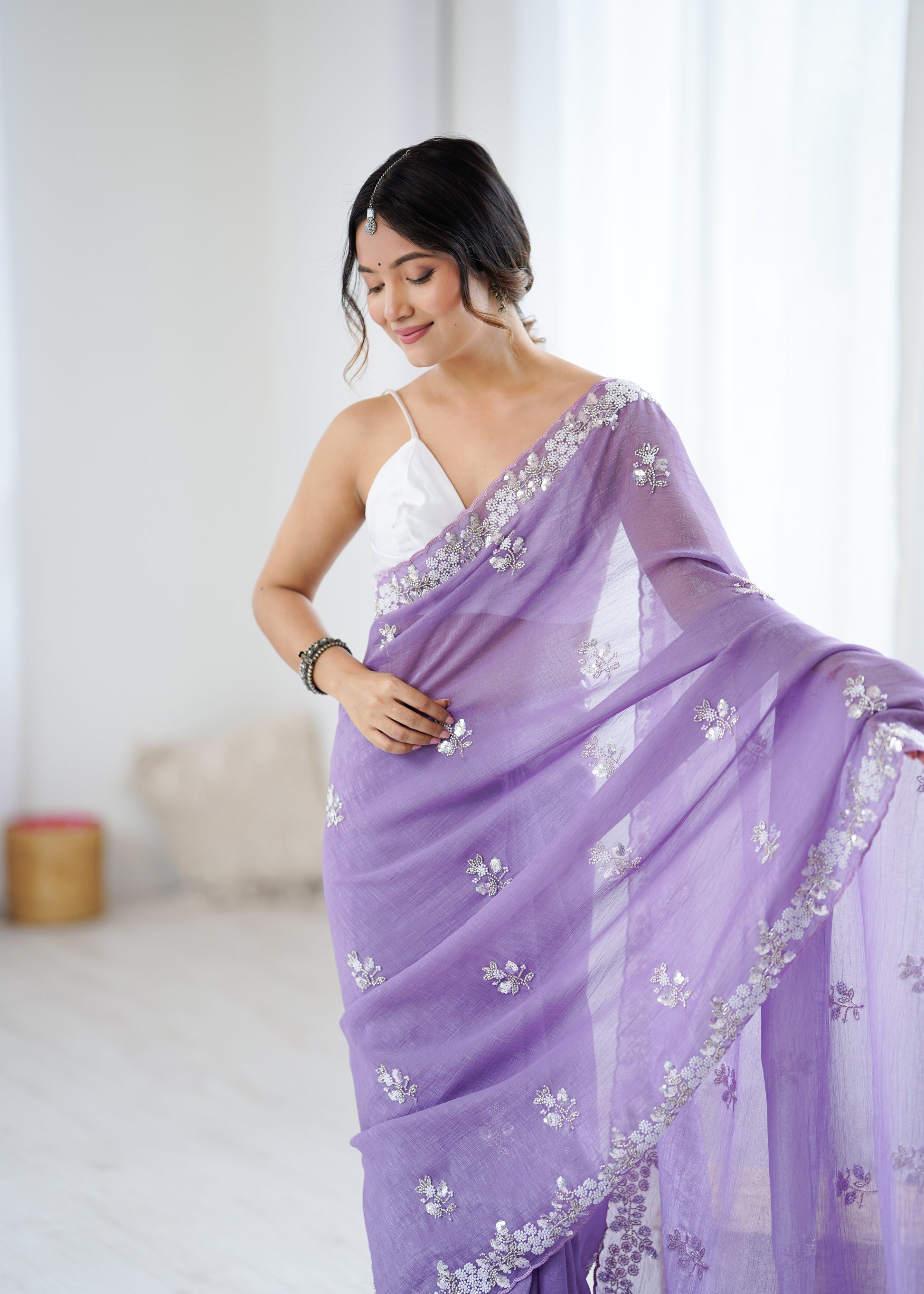 Transform your ethnic ensemble with this exquisite chiffon blouse piece, where artisanal craftsmanship meets modern elegance. The captivating shaded crush technique adds visual richness, while lavish embroidery featuring sequins, moti pearls, and cut dana work creates a mesmerizing sparkle. Constructed from premium ultra-satin fabric, it offers a luxurious drape and radiant finish that commands attention. Ideal for weddings, celebrations, and festive occasions, this versatile piece complements sarees, lehengas, and traditional attire beautifully. Invest in quality and timeless style with this intricately detailed blouse piece that celebrates heritage craftsmanship.