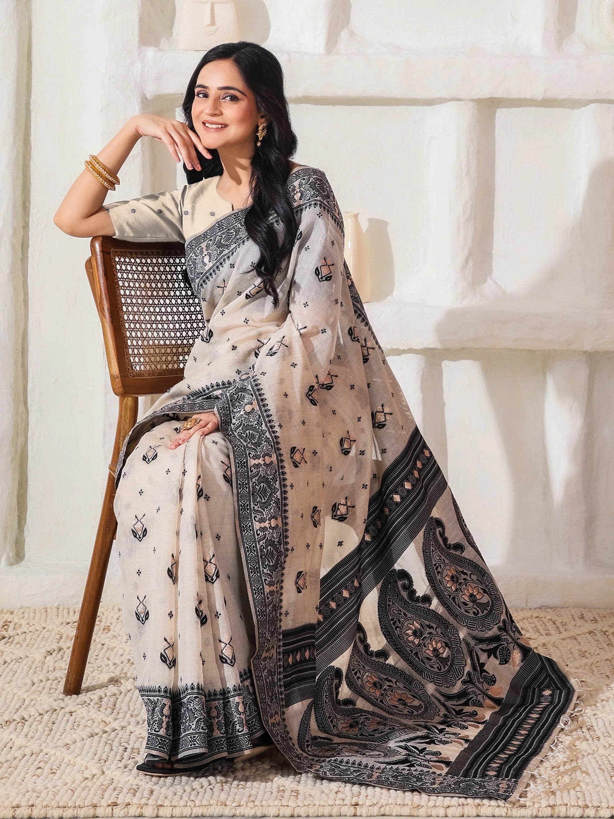 Cream Linen Cotton Saree With Blouse Piece