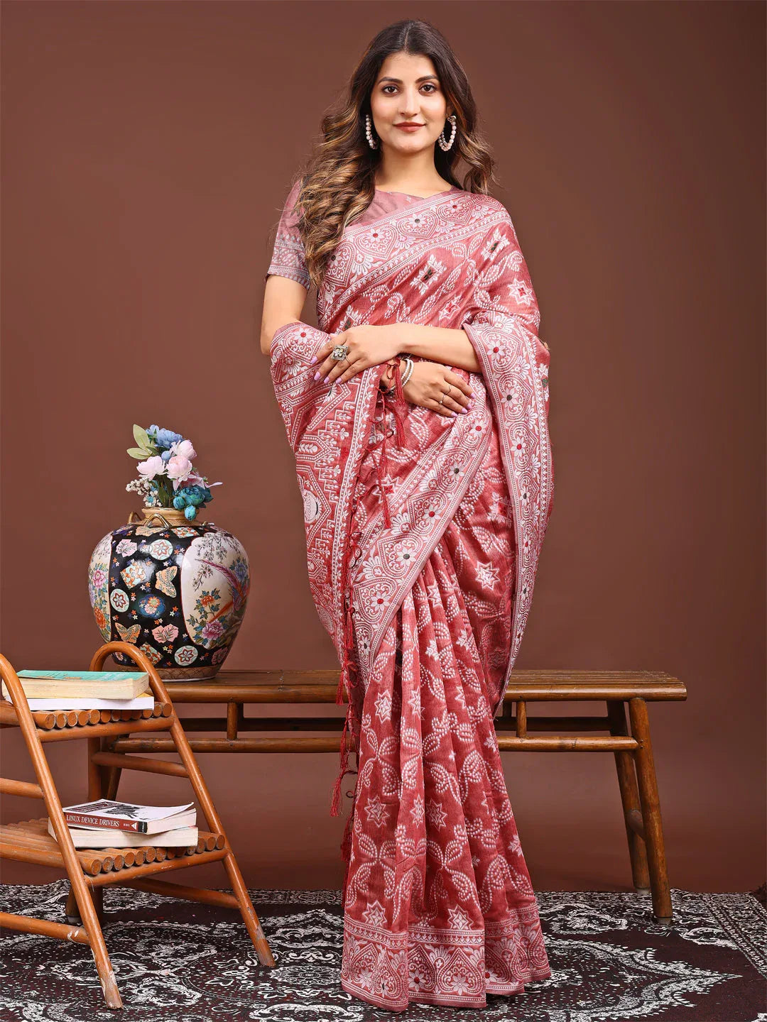 Drape yourself in effortless elegance with this linen cotton saree! Crafted from a breathable blend that keeps you cool and comfortable all day long, this timeless piece is perfect for both casual gatherings and festive occasions. The natural texture adds a touch of understated sophistication, while the included blouse piece ensures you're ready to shine. Whether you're heading to a family dinner or a weekend celebration, this versatile saree is your go-to companion for looking absolutely stunning without breaking a sweat.