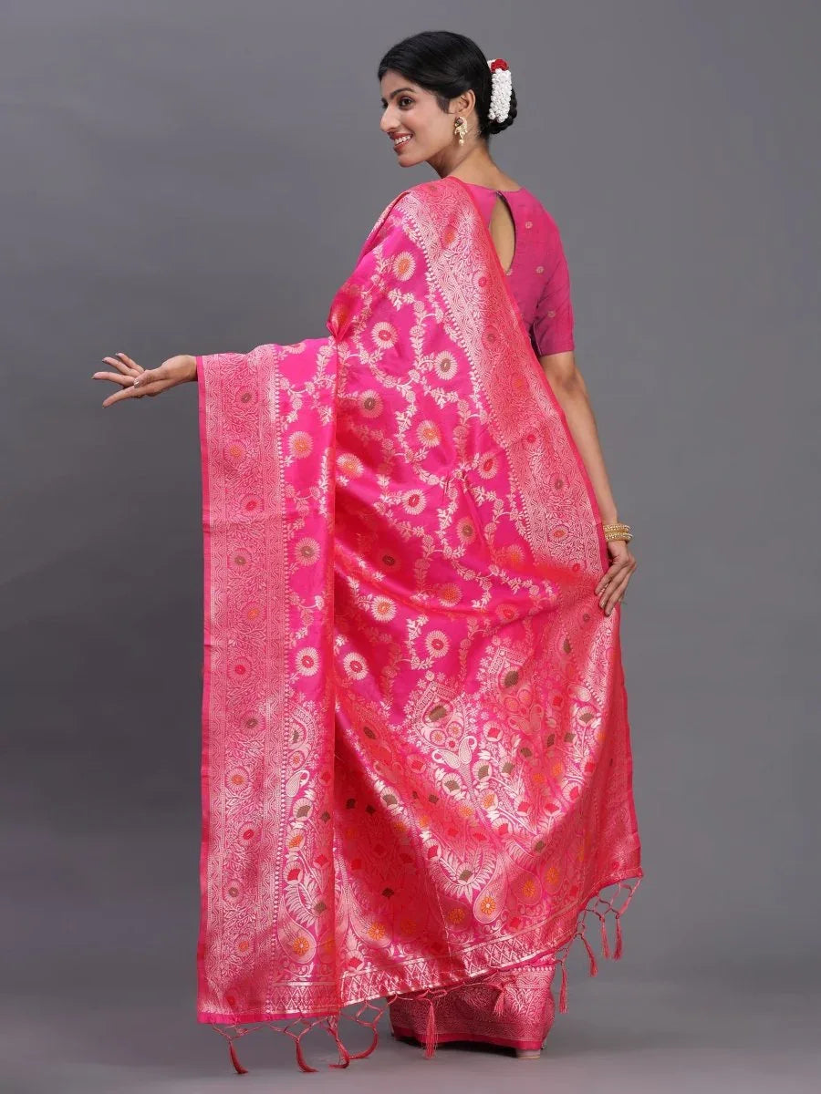Experience the refined elegance of this Banarasi silk saree, a distinguished creation showcasing the region's legendary weaving tradition. Crafted from premium silk with intricate zari embellishments and classical motifs, this saree exemplifies superior craftsmanship and luxurious texture. The included blouse piece offers flexibility for custom tailoring to suit your preferences. Perfect for significant celebrations, weddings, and formal gatherings, this saree delivers both aesthetic sophistication and enduring quality. An essential addition to any discerning wardrobe, blending heritage artistry with contemporary styling possibilities.