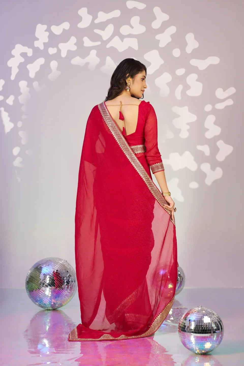 Skip the tailor visits and dive straight into dazzling style! This ready-to-wear Crunchi saree comes complete with an embroidered blouse piece that's already prepped for you. The delicate embroidered lace borders add that extra sparkle and sophistication to your look. Whether you're heading to a celebration or want to feel fabulous on an ordinary day, this hassle-free ensemble lets you look absolutely stunning without the fuss. Comfort, elegance, and zero stress—all wrapped into one!