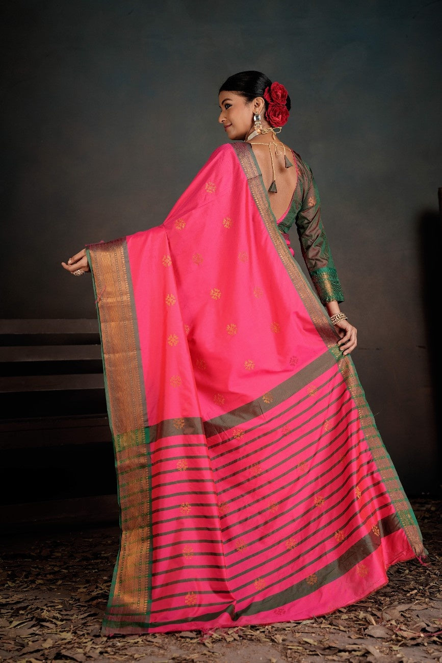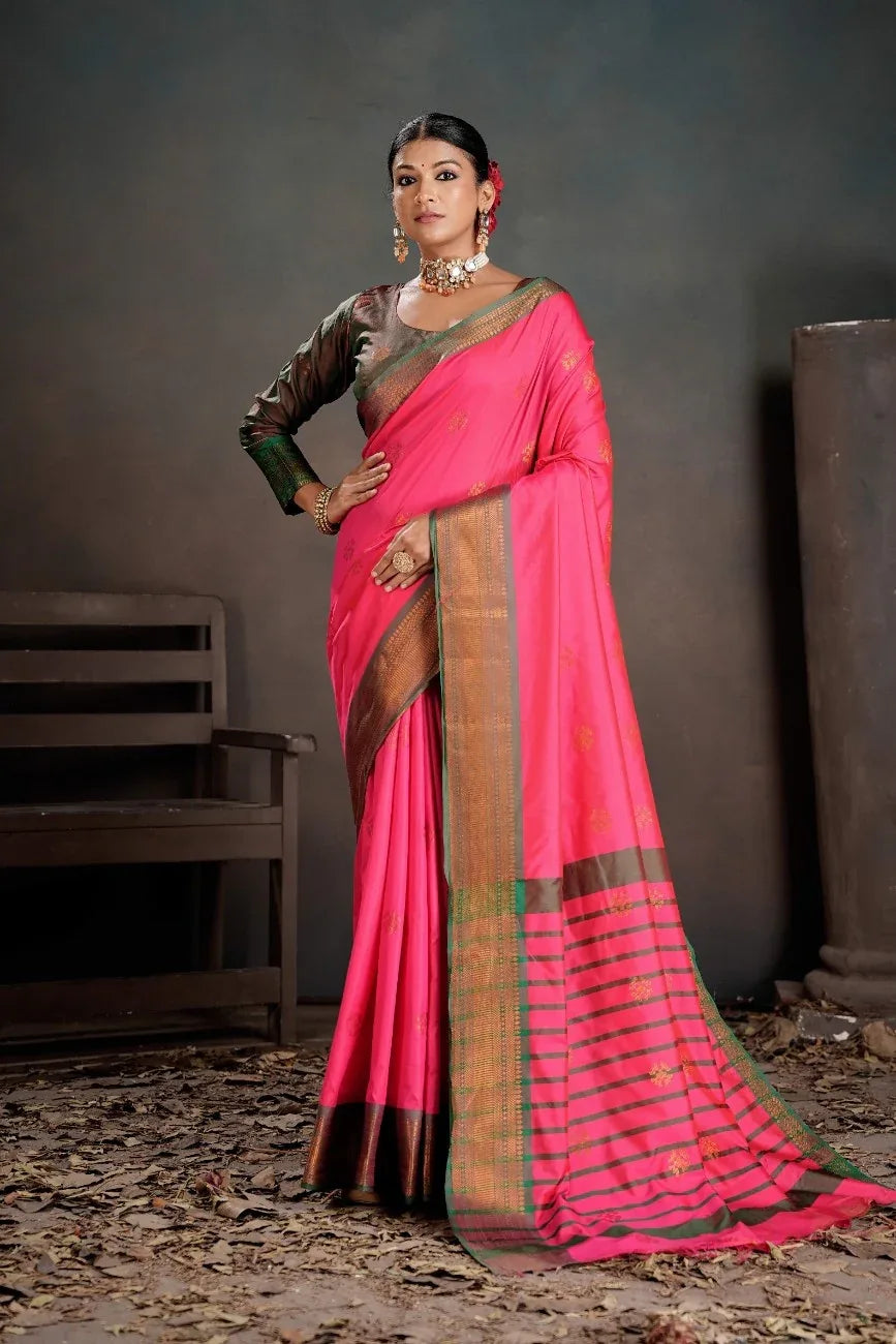 Drape yourself in elegance with this stunning soft silk saree featuring an intricate chitt pallue design that catches every light beautifully. The contrast blouse weaving adds a playful pop of personality, making it perfect for celebrations, festivals, or whenever you want to feel absolutely fabulous. Crafted from premium soft silk, it promises comfort without compromising on that showstopping glamour. Whether you're attending a wedding or a special gathering, this saree is your ticket to turning heads and feeling like the star you are!