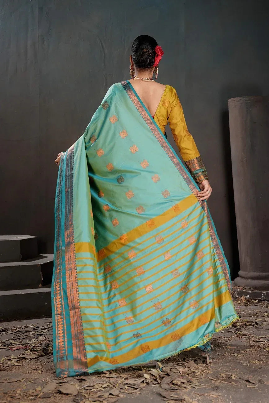 Drape yourself in timeless elegance with this exquisite soft silk saree, featuring intricate chitt pallue weaving that showcases traditional craftsmanship. The contrasting blouse piece complements the saree beautifully, offering a coordinated look that's ready to wear. Crafted from premium soft silk, this saree ensures comfort throughout the day while maintaining its graceful drape. Perfect for weddings, festivals, and special occasions, this piece celebrates authentic Indian textile artistry with a modern sensibility. Elevate your ethnic wardrobe with this versatile saree that effortlessly transitions from celebrations to gatherings.