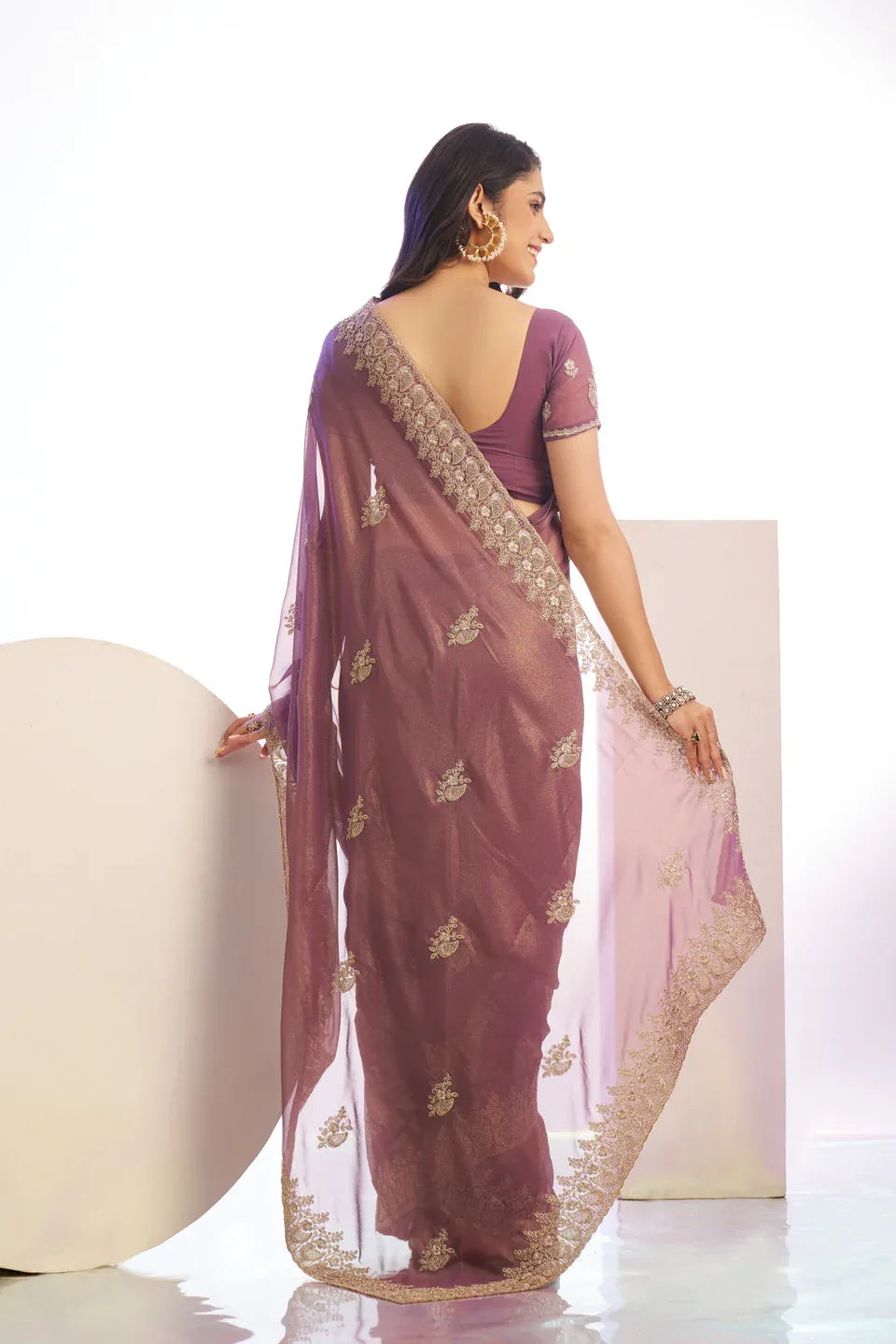 Unleash your boldest style with this tissue saree—a fearless fusion of tradition and contemporary flair. Intricate embroidered work adorns the entire drape, creating a mesmerizing play of light and texture that commands attention. The delicate tissue fabric drapes with ethereal grace, perfect for those who refuse to blend in. Paired with a matching embroidered blouse piece, this ensemble is designed for the woman who dares to make a statement. Ideal for weddings, celebrations, or any occasion where you want to turn heads and redefine elegance on your own terms.