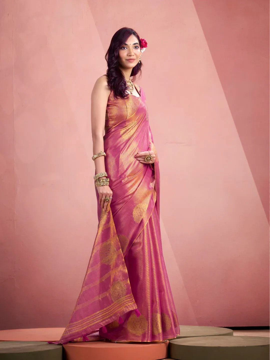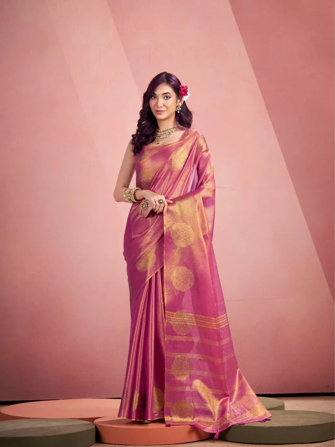 Elevate your ethnic wardrobe with this stunning Tissue Fancy Weaving Saree, a perfect blend of tradition and contemporary elegance. Crafted from premium tissue fabric, this saree features intricate fancy weaving patterns that catch light beautifully, creating a mesmerizing shimmer with every movement. The delicate drape and lightweight construction ensure all-day comfort, making it ideal for weddings, festivals, and special occasions. The sophisticated weave work adds depth and dimension to your look, while the versatile design pairs effortlessly with traditional jewelry and accessories. Experience the luxury of fine craftsmanship that transforms you into the center of attention.