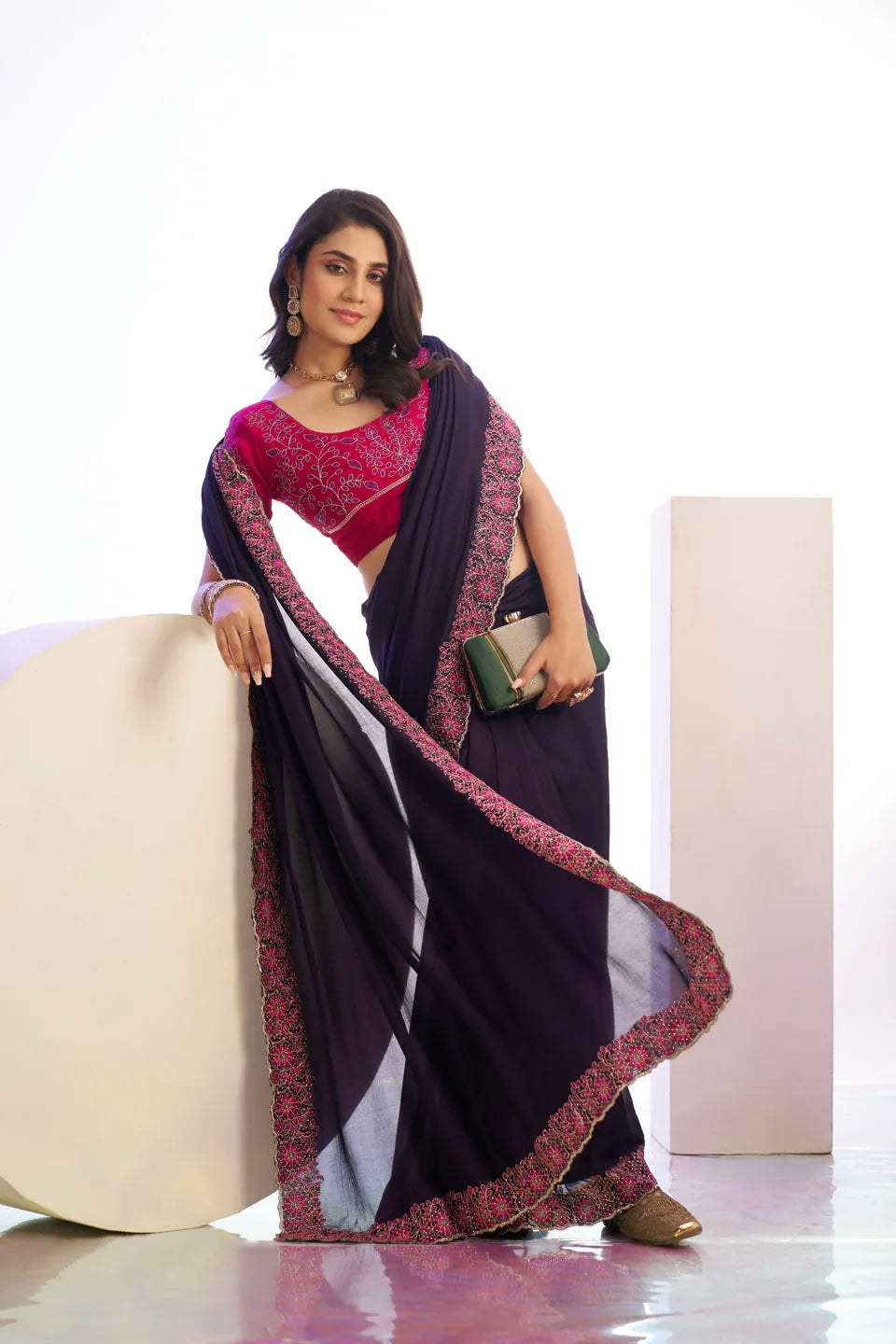 Get ready to dazzle in this fabulous Vichitra Crunchi saree, where playful sequins dance across intricate embroidered patterns that'll have everyone asking for your secret. The crinkled texture adds dimension and movement, while the luxurious fabric feels as good as it looks. Complete with a matching blouse piece, you're all set to steal the spotlight at weddings, festivals, and celebrations. Wrap yourself in sparkle, confidence, and pure fun!
